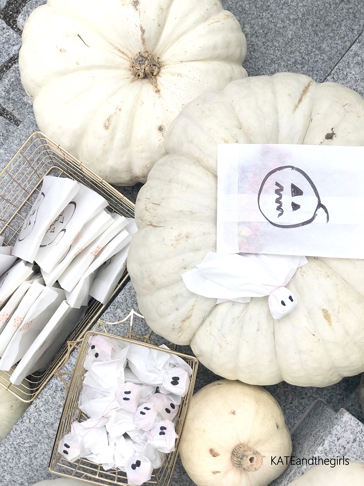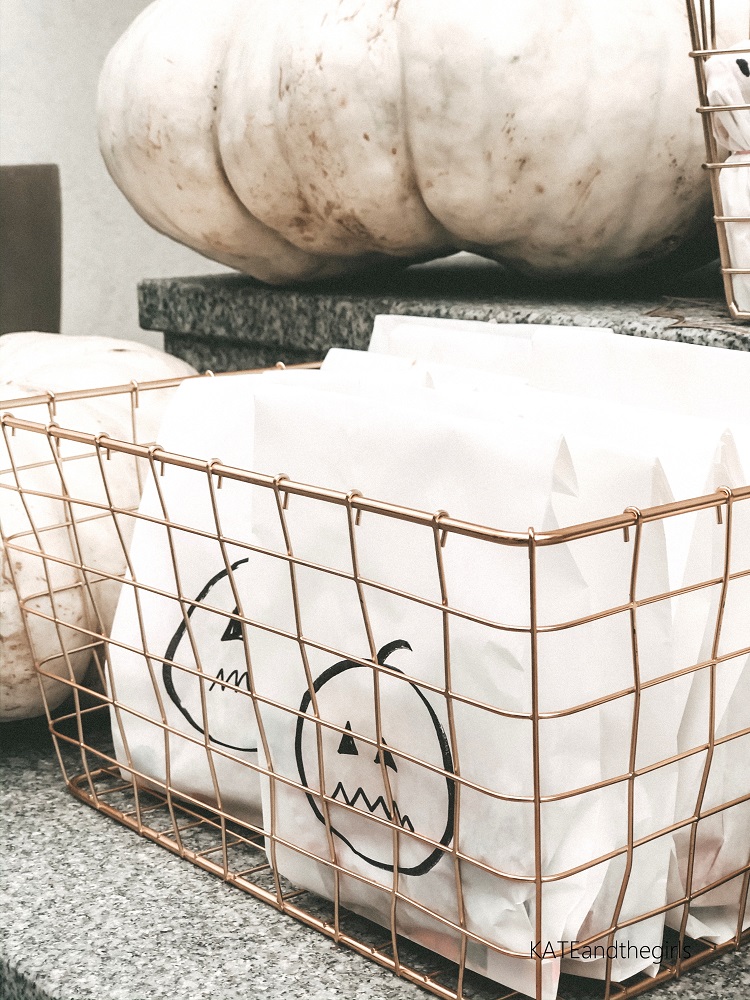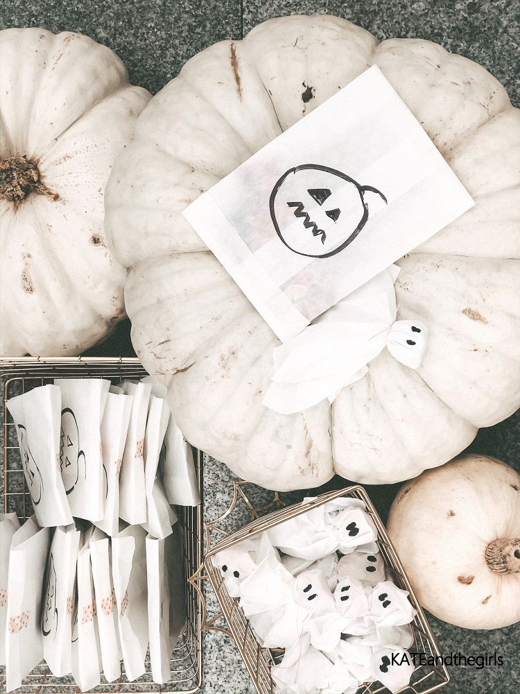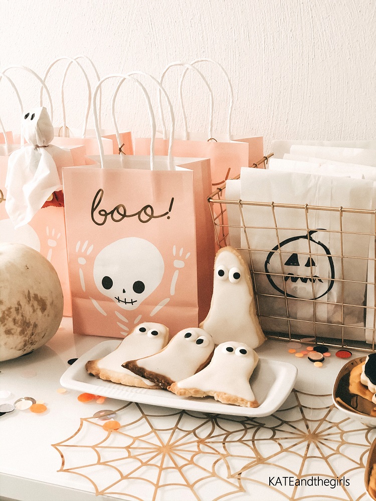 Animiert wurde ich von meiner Freundin Anni, die einfach die schönste Partydekorationen aller Zeiten anbietet. Klassisch basteln wir seit Jahren die Lolligeister für alle, die an unserer Tür klingeln. Für die bunten Süßigkeiten verwenden wir Butterbrotpapiertüten, auf die wir mit Edding Kürbisköpfe malten. Wir befüllen die Tüten mit Süssem, Saurem und Konfetti.  Insgesamt sieht doch alles gleich viel schöner aus und ich schwöre, jedes Kind freut sich!