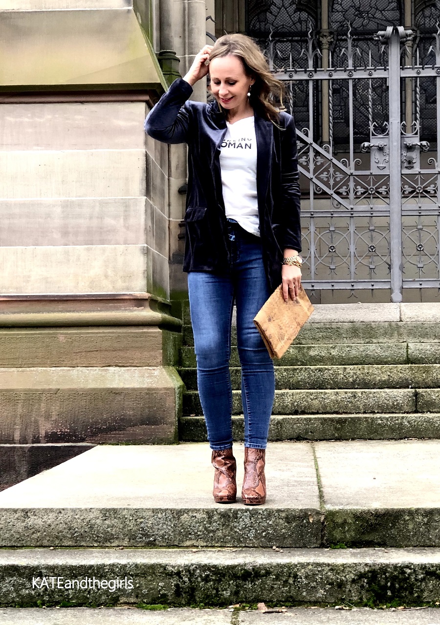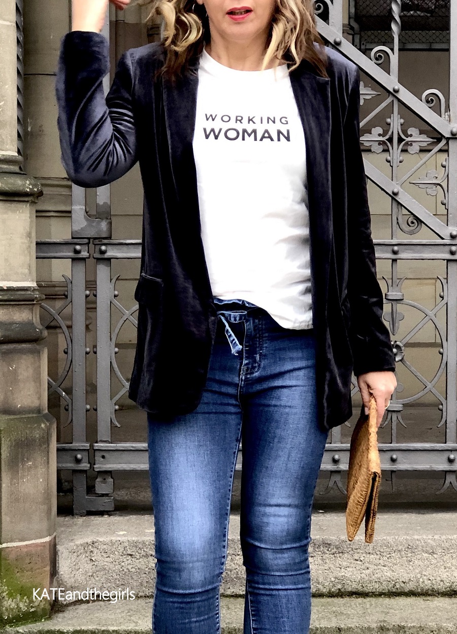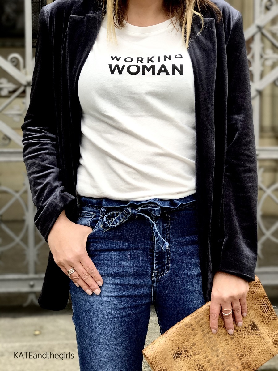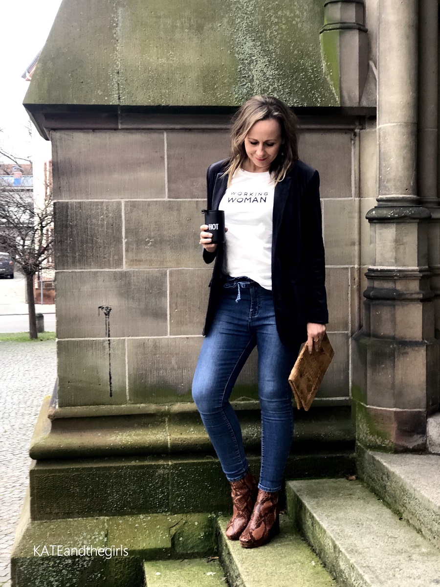 Jeans & T-Shirt kombiniert mit Samtblazer und hohen Schuhen ist sowohl businesstauglich als auch abends für die Afterworkparty geeignet.
