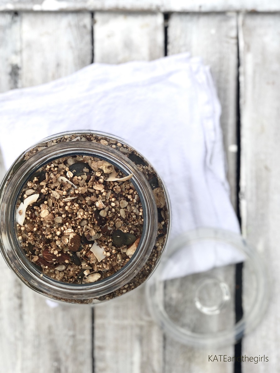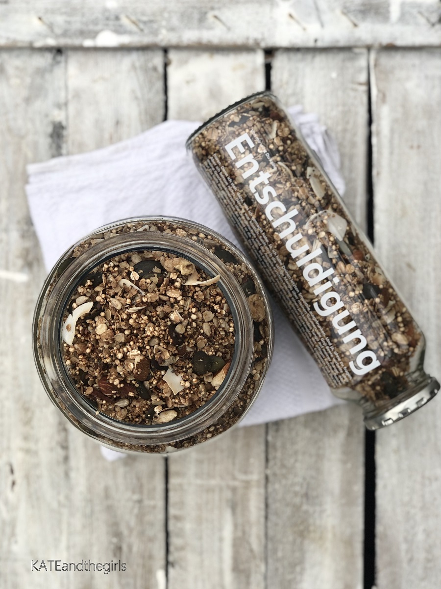 Mein Mann ist diese Woche verreist, ich manage die 4 Girls also alleine. Deshalb kreierte ich am Wochenende ein neues Granola, um morgens schon zielsicher zu starten. Es ist so gesund doch gleichzeitig crunchy und lecker. Man sagt ihm nach, es verleihe Superkräfte. (Buchhaltung läuft von selbst, Wäschekörbe lösen sich in Luft auf usw.)