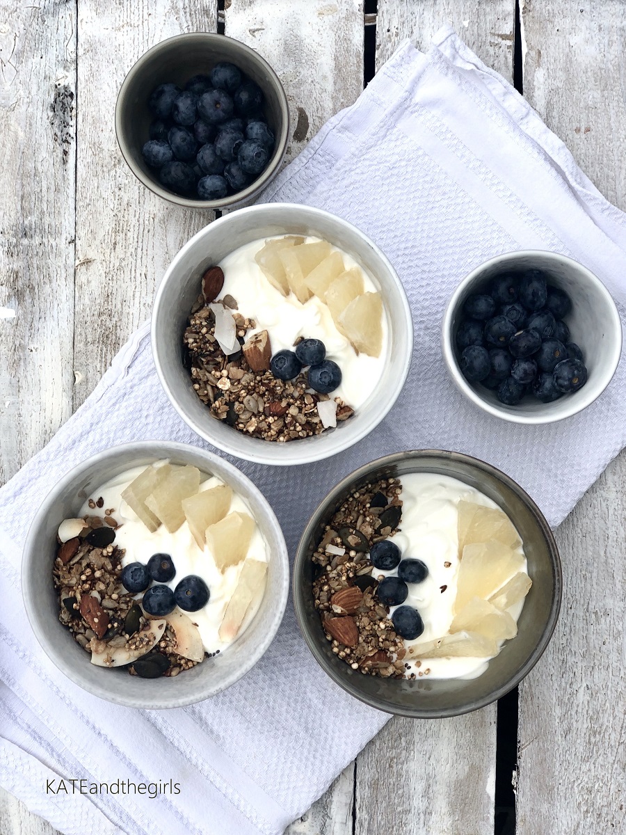 Wir essen das SUPERFOOD GRANOLA mit Joghurt und frischen Früchten. Für manche streue ich noch Rosinen, für andere getrocknete Cranberrys oder Aprikosen darüber.