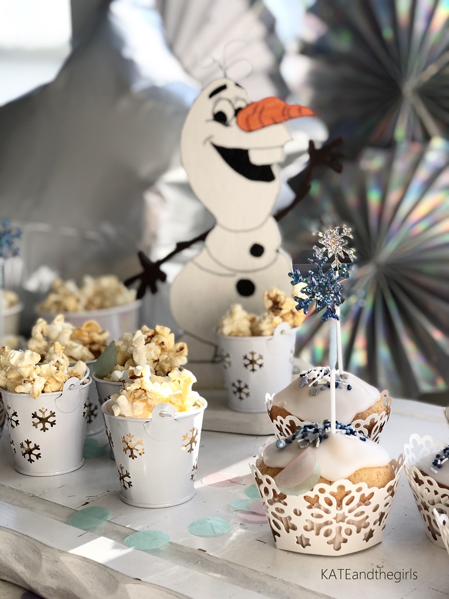 Diese Eimerchen sind zuckersüss und dürfen auf dem Elsa-Sweettable nicht fehlen. Ich befüllte sie mit Popcorn. Die Mädchen liebten es, deshalb gab es auch welches in perlmutfarbenen Bechern.