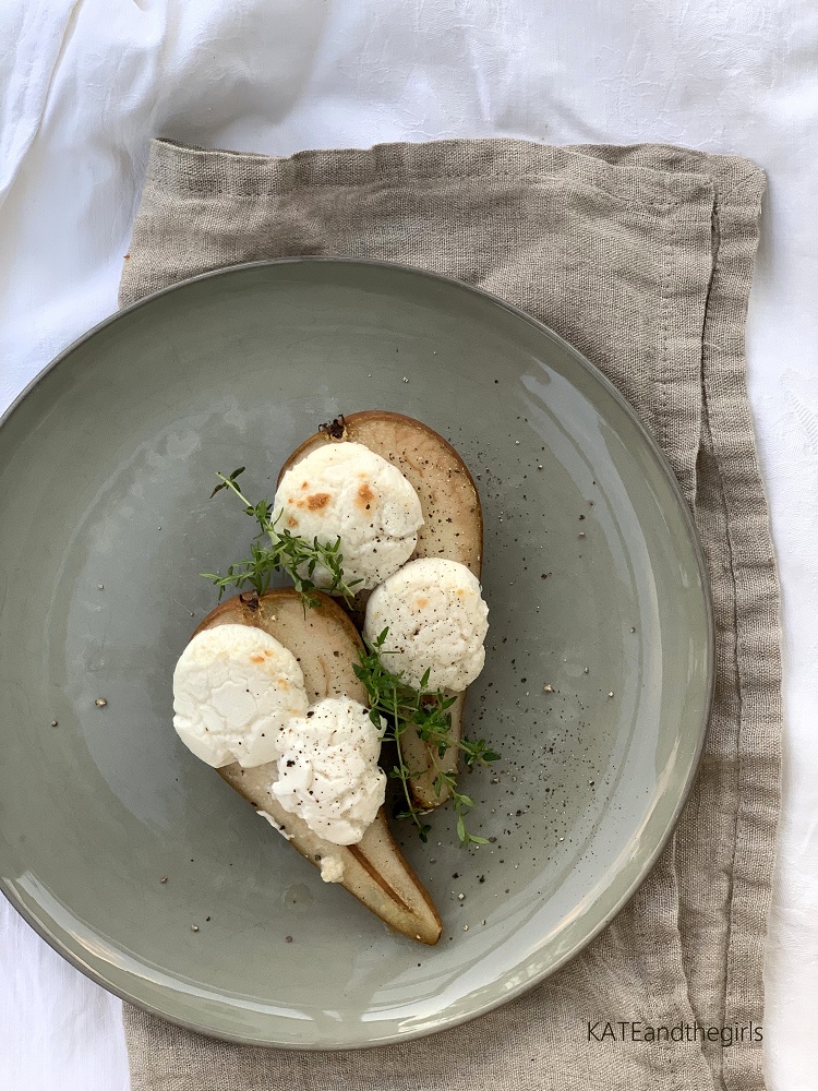 Nun die Käsetaler auf die Birne geben und mit dem Honig beträufeln. Alles noch ein paar Minuten im Ofen lassen, bis der Käse gegrillt aber noch nicht geschmolzen ist.